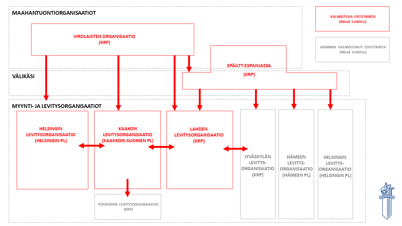 Kuva 8: Kaaviossa on havainnollistettu, millä tavalla huumausaineiden maahantuonteja, vastaanottoa ja levittämistä oli järjestelty ja miten tutkintavastuut poliisiyksiköiden kesken on jaettu.