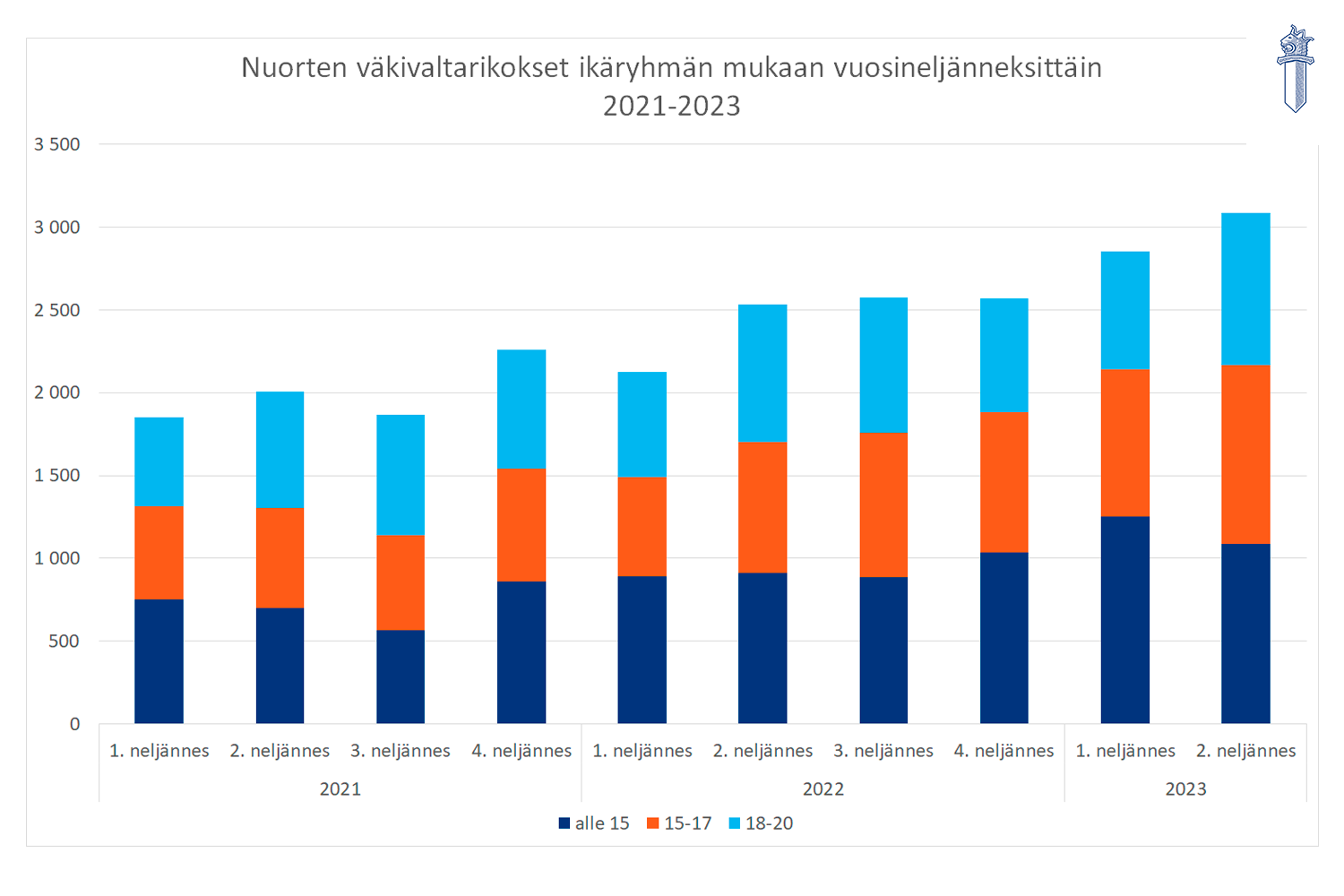Kuvio: Nuorten väkivaltarikosepäilyt (pahoinpitelyt, henkirikokset ja ryöstöt) neljännesvuosittain vuosina 2021-2023 ikäryhmän mukaan.