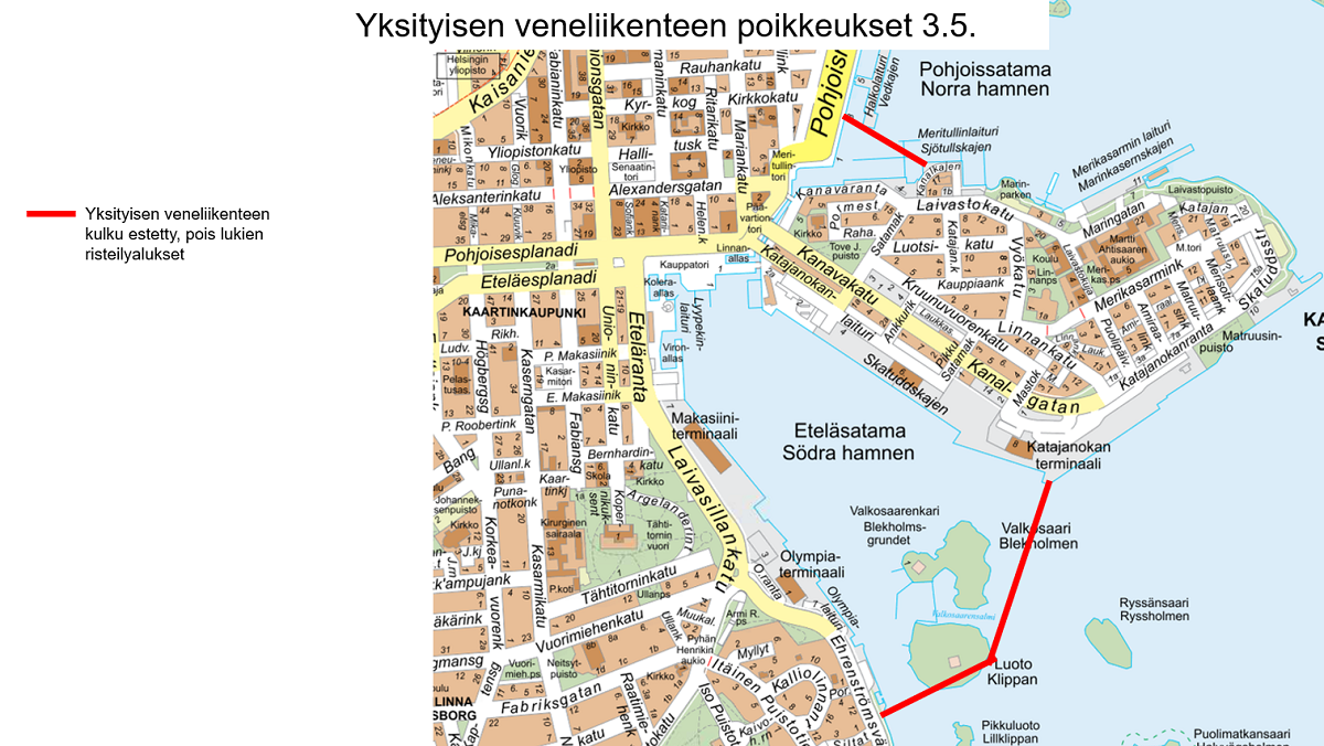 Sveaborgs färjetrafik sköts från den kaj som Sveaborgs servicefärja avgår från på Skatudden. Salutorgets sjöbuss- och kryssningskajer är ur bruk. Privat sjötrafik till Södra hamnen är förhindrad. Blockaden gäller inte kryssningstrafiken från Olympiaterminalen och Skatuddens terminal till Tallinn och Stockholm. Vid Norra kajen är privat sjötrafik förhindrad i området söder om Vedkajen.