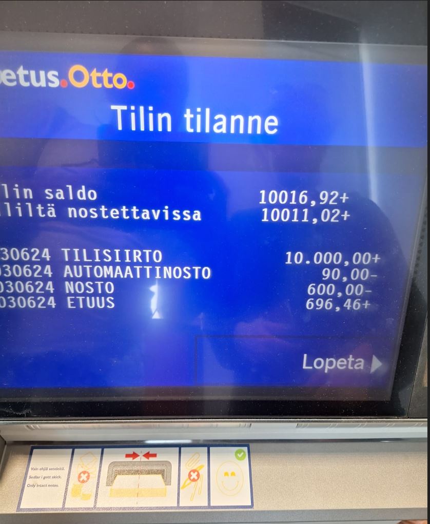 Tilin saldo automaatilla, bulvaani osoittaa, että tilisiirto on tehty.