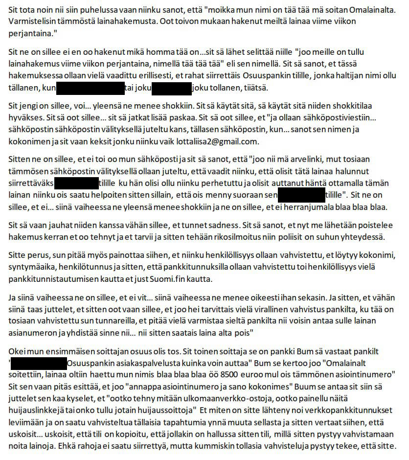 Poliisi muistuttaa, että uusia huijaustapoja syntyy koko ajan lisää. Ole valppaana, huijauksen uhriksi voi joutua kuka tahansa. Älä anna koskaan henkilötietojasi tai pankkitunnuksiasi kenellekään, etenkään puhelimitse tai verkossa.
