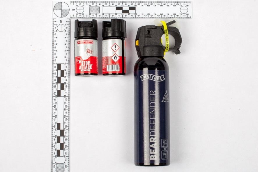 Kuva 3: Takavarikoitu käsikahvainen kaasusumute ja kaksi pienempää pippurisumutetta.
