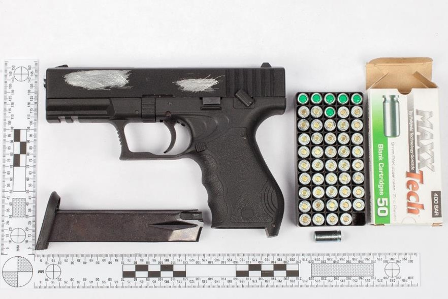 Kuva 4: Epäillyiltä takavarikoitu 9mm kaasuase ja siihen kuuluvia paukkupatruunoita.