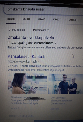 Oheisessa kuvakaappauksessa näkyy ensimmäisenä hakutuloksena huijausmainos. Sen tunnistaa pienestä Mainos-tekstistä vasemmassa alareunassa. Lisäksi hakutuloksen osoite on erilainen kuin oikeassa Omakanta-palvelussa.