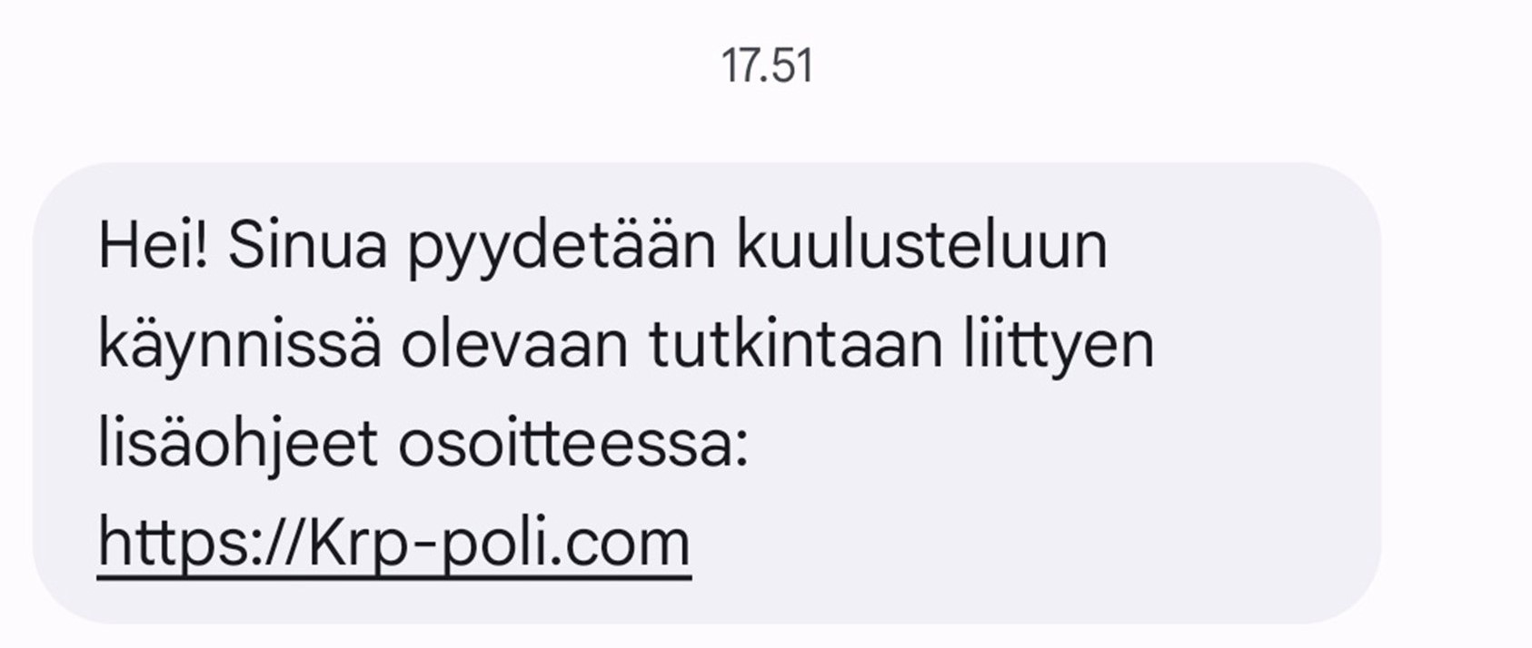 Poliisi on saanut useita ilmoituksia Keskusrikospoliisin nimissä lähetetyistä SMS-viesteistä, joissa pyydetään vastaanottajaa kuulusteluun. Viesti ei ole poliisin lähettämä, eikä siihen tule reagoida.