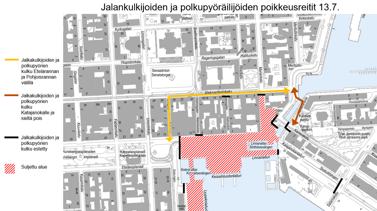 Kauppatorin ympäristön liikenteessä on seuraavia poikkeusjärjestelyjä 13. heinäkuuta: