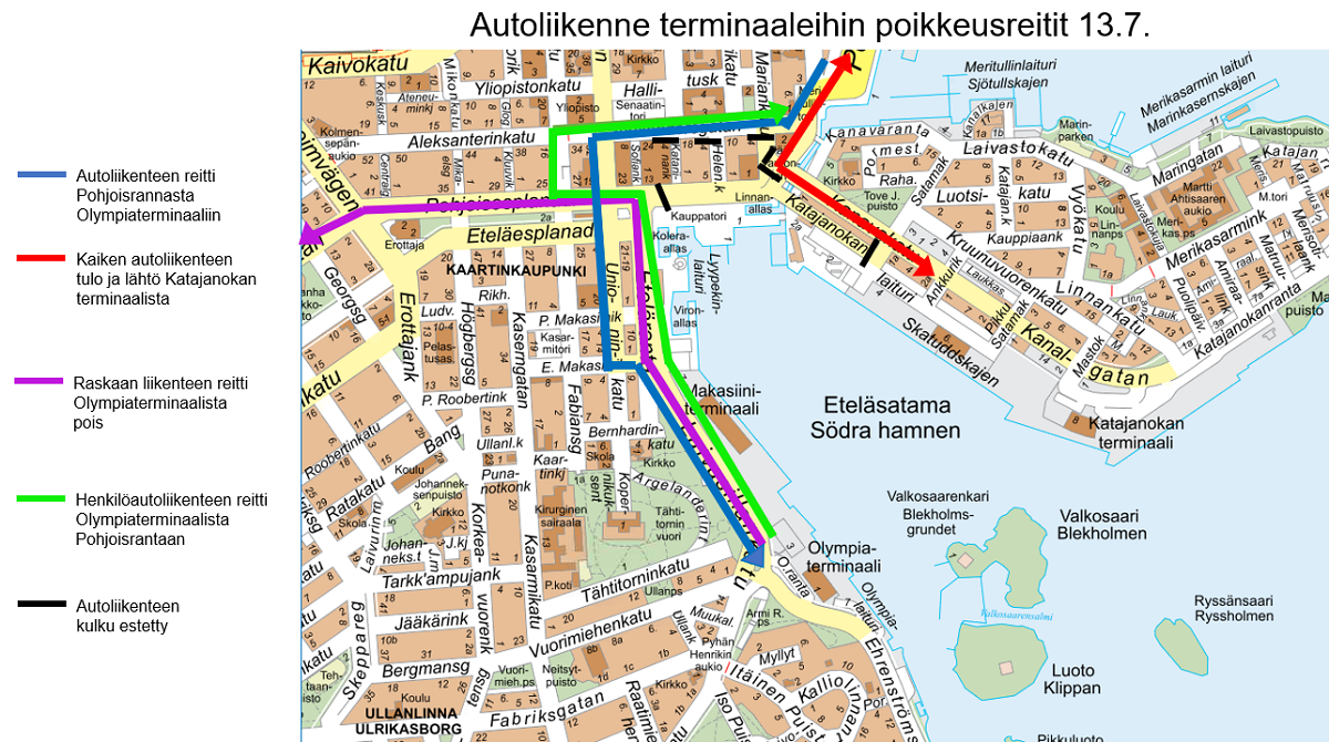 • Olympiaterminaalista saapuva raskas ajoneuvoliikenne ohjataan reittiä Pohjoisesplanadi–Lönnrotinkatu–Hietalahdenkatu–Hietalahdenranta.