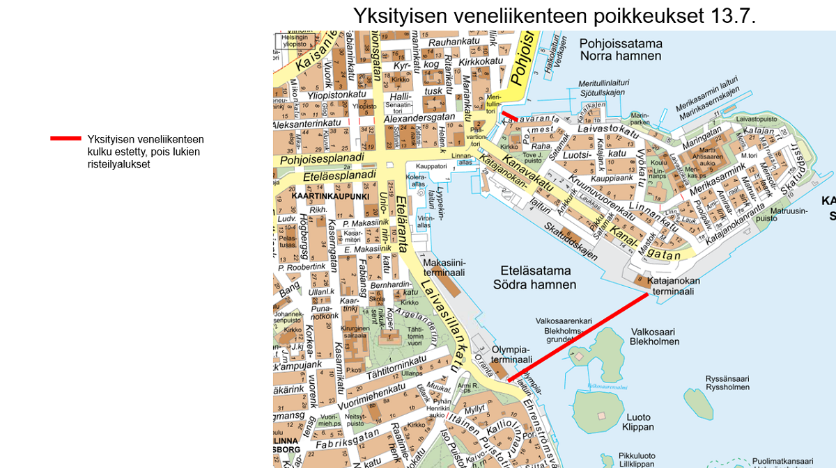 Private waterborne transport will not be allowed in Eteläsatama. This does not apply to cruise ships sailing to Tallinn and Stockholm from the Olympia Terminal and the Katajanokka Terminal. Water traffic in the channel between the Main Guard Post and Katajanokka will be forbidden.