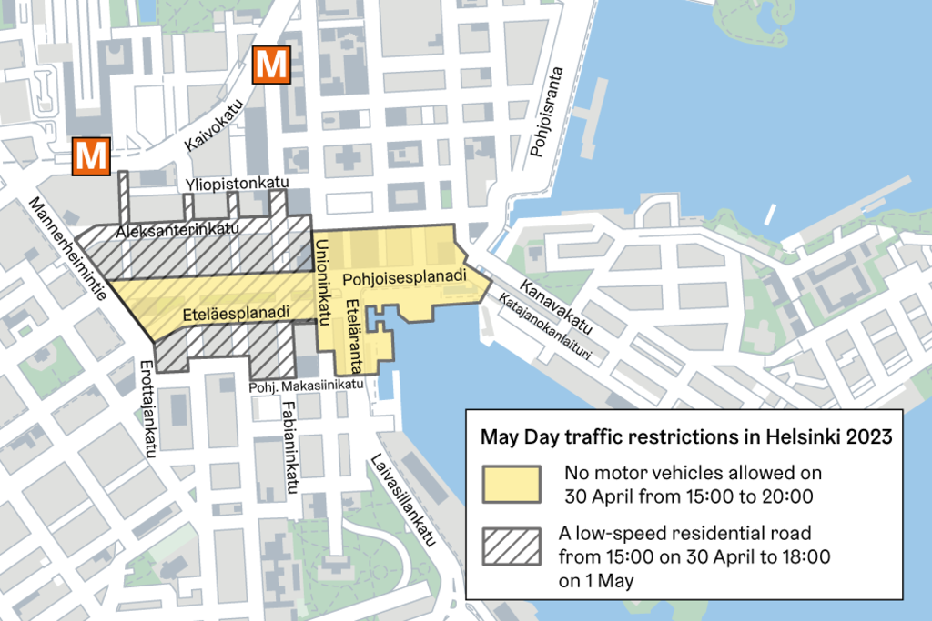 Read more from the City of Helsinki article: Traffic restrictions around the Market Square and Pohjoisesplanadi and Eteläesplanadi streets on May Day Eve and May Day | City of Helsinki