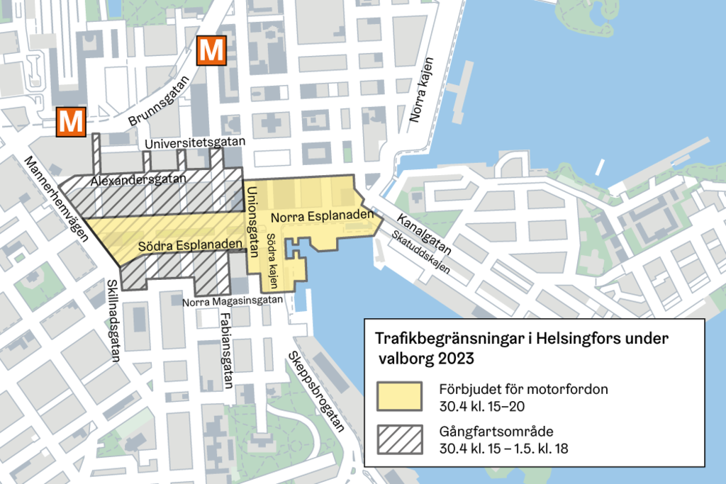 •    Områdena runt Salutorget och Esplanaderna stängs på valborgsmässoafton 30.4 kl. 15–20 för all motorfordonstrafik.