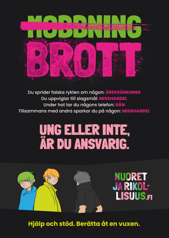 Polisen vill väcka och föra en samhällsdebatt om ungdomsbrottsligheten och dess effekter. Som ett led i detta har polisen skickat ut en kampanjaffisch till alla 2119 låg- och högstadier i Finland för att påminna om att det som uppfattas som mobbning i själva verket ofta är ett brott.