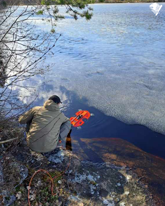 Gränsbevakningsväsendets dykningsenhet vid Finska vikens sjöbevakning undersöker delar av flygfordonet i Luumäki. Bild: Gränsbevakningsväsendet