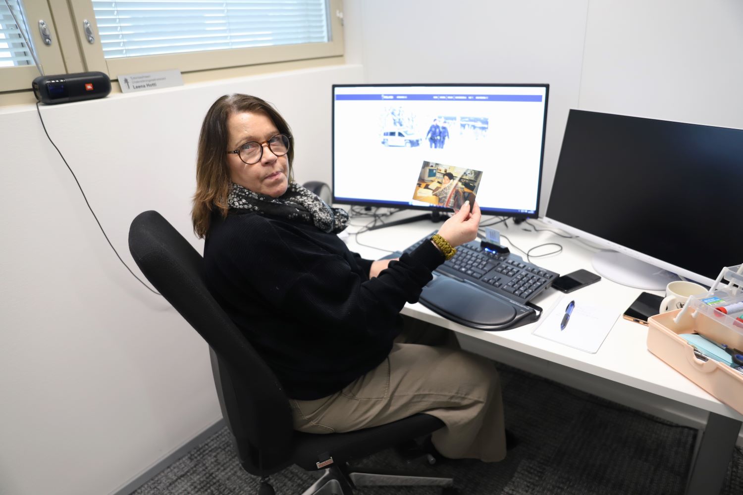 Bildtext: Utredningssekreterare Leena Hotti visar ett foto där hon sitter vid sitt dåvarande arbetsbord på polisstationen i Vanda 1998.